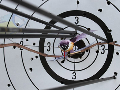 - L’oiseau, du volume du pouce sur deux à peu près, les ailes et les pattes serrées contre le corps et ne faisant aucun relief, est placé devant le noir de chaque carte, à l’aide d’une tige à collet enfoncée dans la carte, tige sur laquelle il est fixé par la queue, au moyen d’un collage solide, mais sans fil de fer ou laiton.